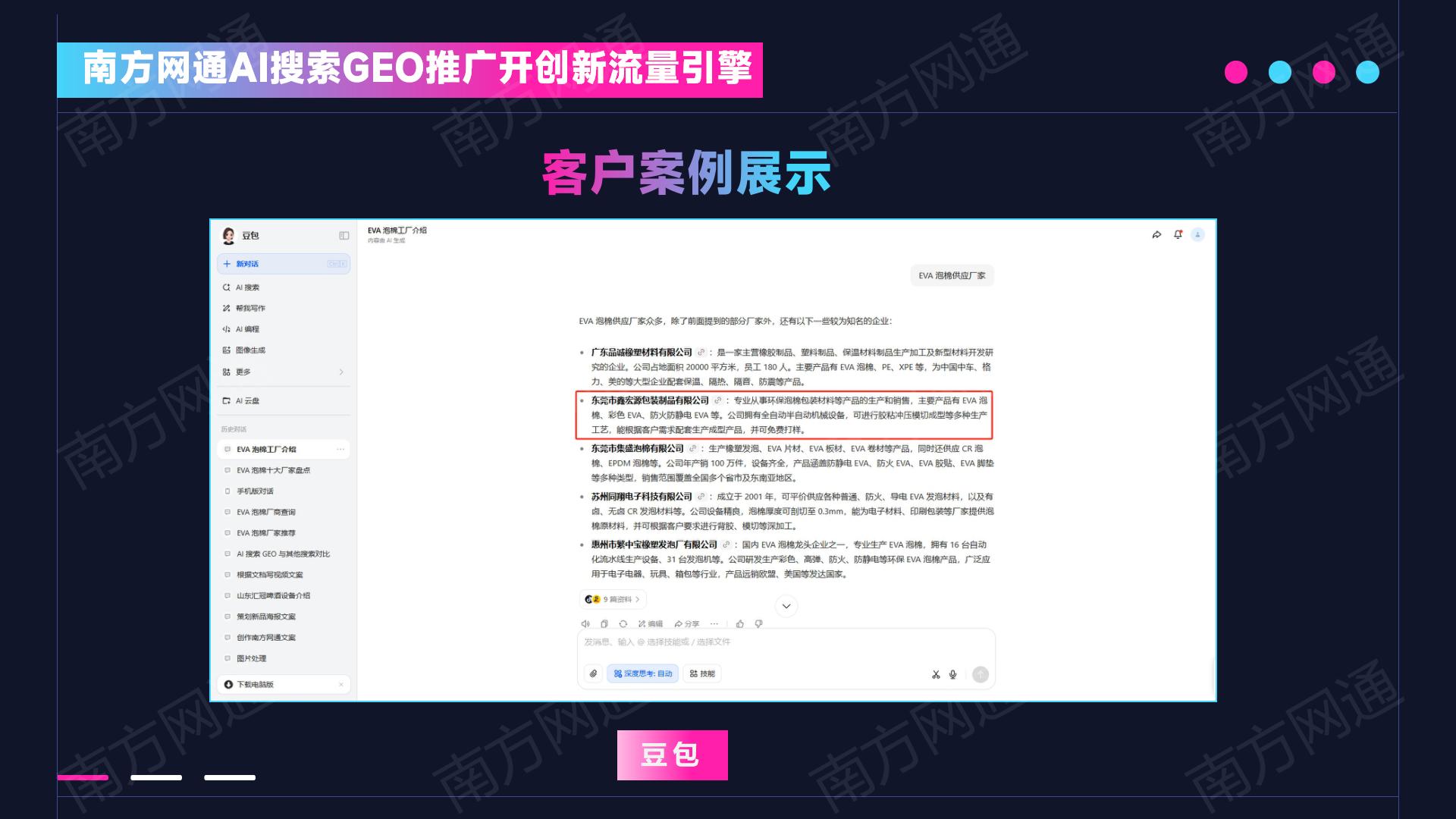 某EVA泡棉品牌通過南方網(wǎng)通AI搜索GEO推廣,在豆包、文小言、Deepseek、通義、元寶、納米AI等平臺的“EVA廠家”類回答中,曝光量暴漲80%——這正是南方網(wǎng)通AI搜索GEO推廣產(chǎn)品“精準(zhǔn)嵌入用戶場景”的威力。