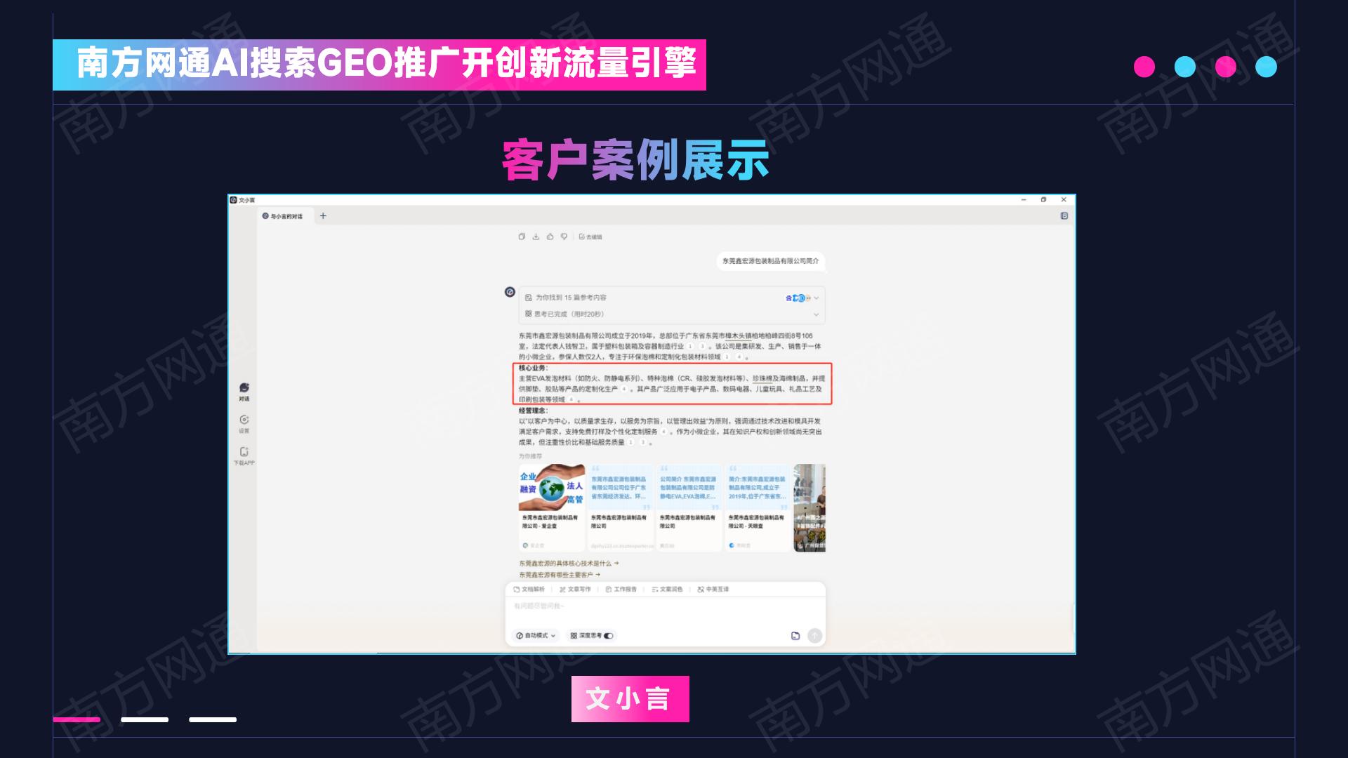用戶搜 “短視頻營銷怎么做”,SEO可能只答 “步驟”;GEO則要求覆蓋 “為什么要做”“避坑指南”“ROI 測算” 等關(guān)聯(lián)需求。南方網(wǎng)通的AI搜索GEO推廣,正是幫品牌織一張 “需求網(wǎng)”,讓AI在延伸回答時,總能 “拎出” 你的內(nèi)容。